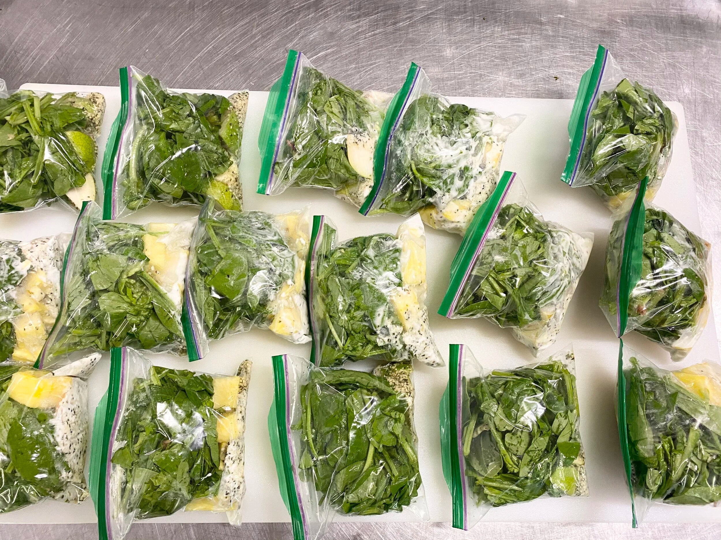 I suggest pouring your can of coconut milk into a bowl so you can give it a good stir and make the consistency even. Have one spoon for your coconut milk, one for your lime juice and one for your hemp hearts so you keep it clean. :) Grab your baggie or container, add your spinach first then follow it up with all other ingredients. Place your containers in the freezer. In the morning simply plop the frozen contents of one bag in the blender, add 1.5 cups of nut milk and your choice of protein powder or collagen should you choose.