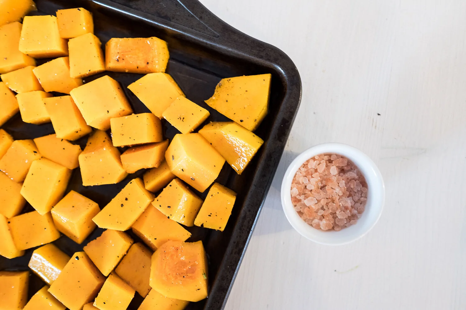 Peel and cube sweet potatoes and butternut squash, toss in olive oil, 3-6 cloves crushed garlic, salt and pepper, and bake at 400F for 30 mins.