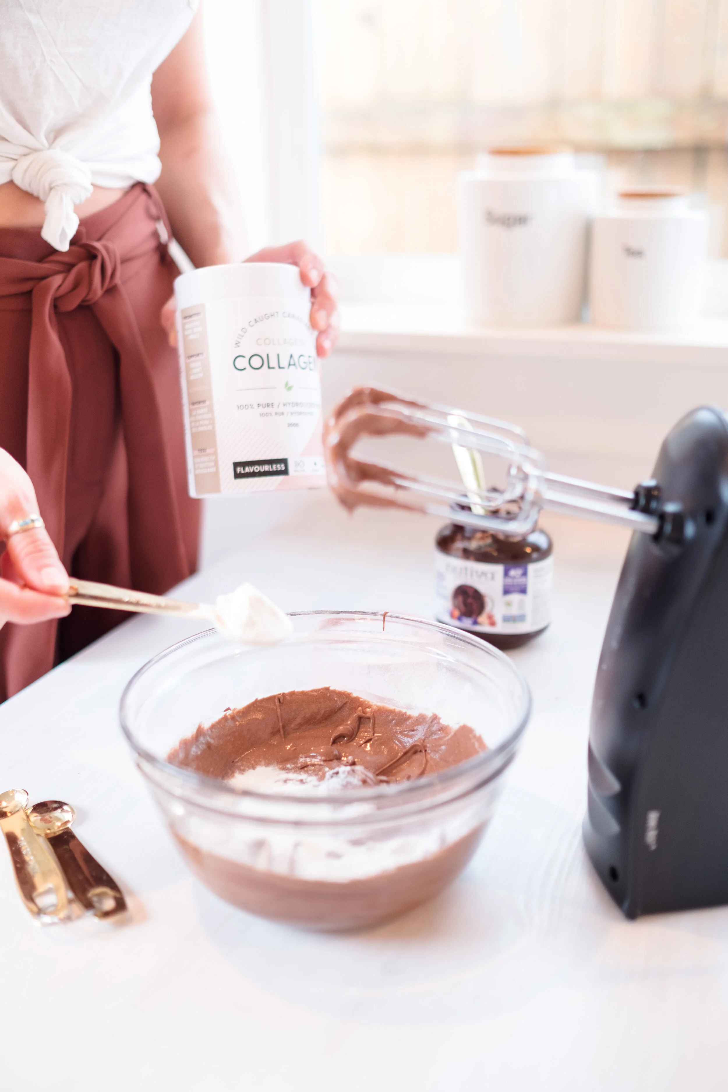 First, combine the collagen, chocolate hazelnut spread, coconut oil, vanilla and salt in a large bowl and mix until evenly combined. Mix it really well so the end result is a nice and creamy texture. Either by hand or with a mixer.