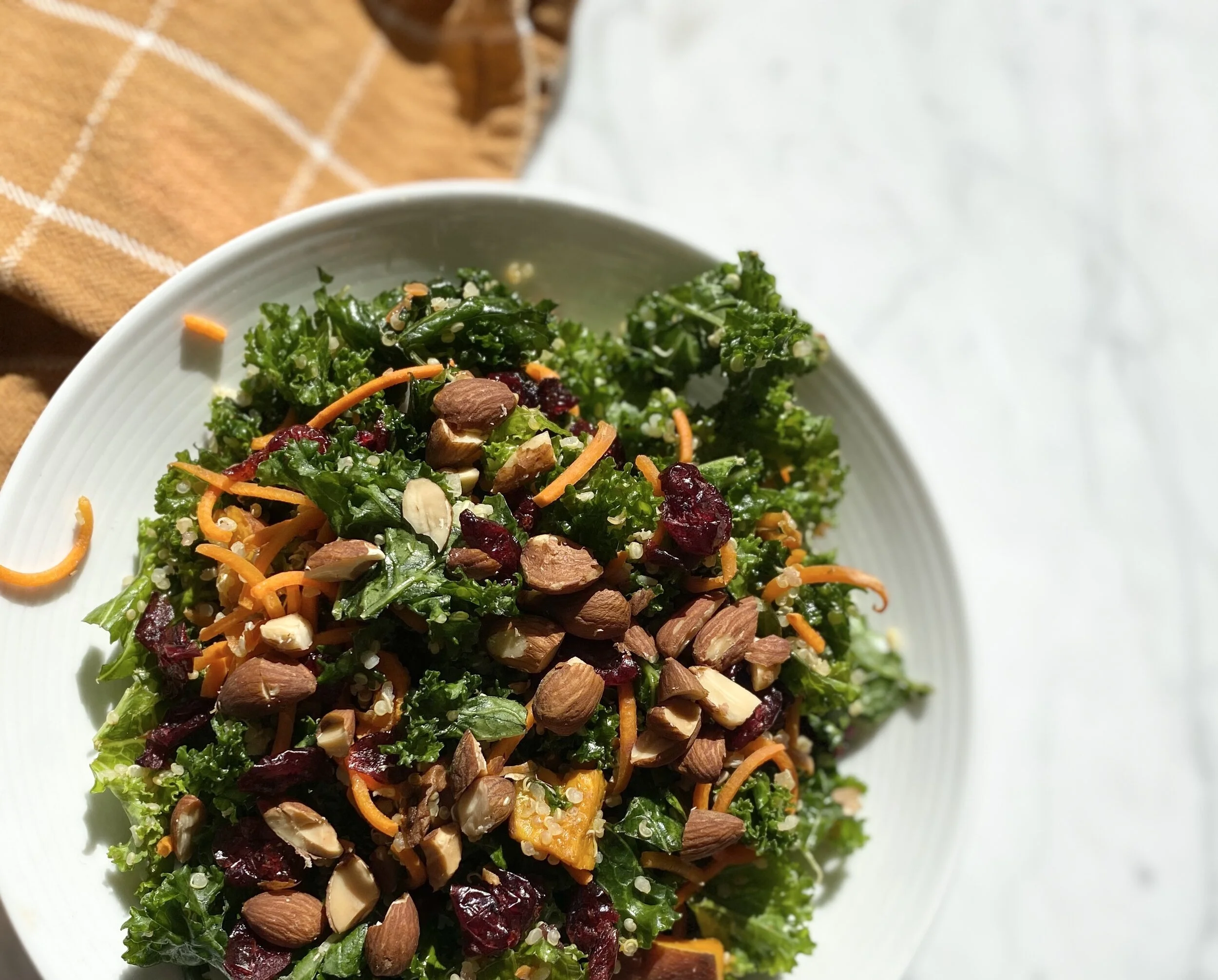 This salad is pretty much the same recipe for our Kale me Crazy salad. It’s the salad I have been making for 10 years that just never goes out of style! I carve it out in the winter months and love how the sweetness of cranberries and sweet potatoes compliment the zip of garlic and dijon. It’s the salad I eat the most cause it’s delicious and filling, and I always feel sexy afterwards!