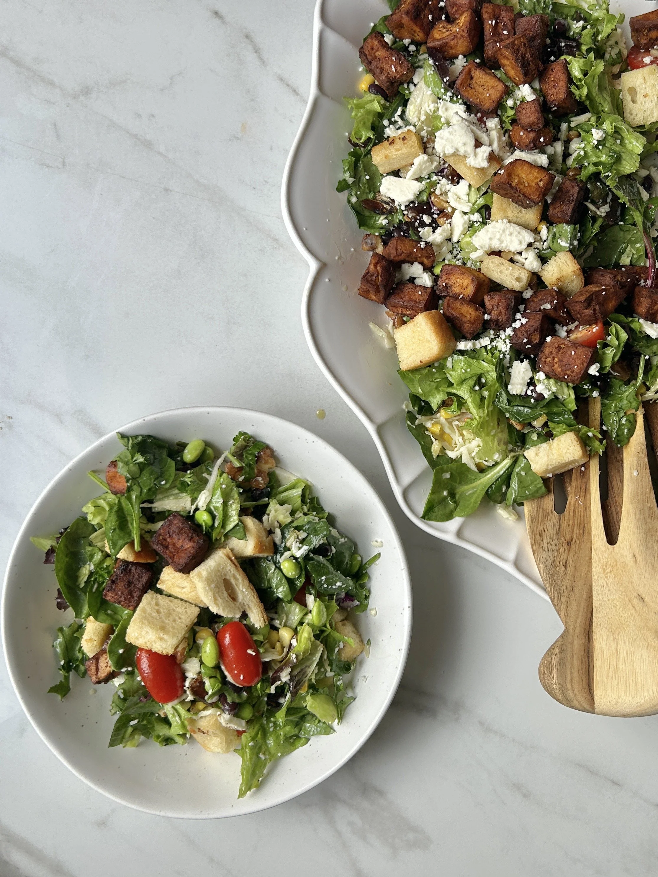 SALAD Add everything but the feta, tofu and avocado into a bowl and toss to combine. Serve in a shallow dish or large plate to display the ingredients beautifully. Add sliced tofu and avocado then sprinkle with the feta.