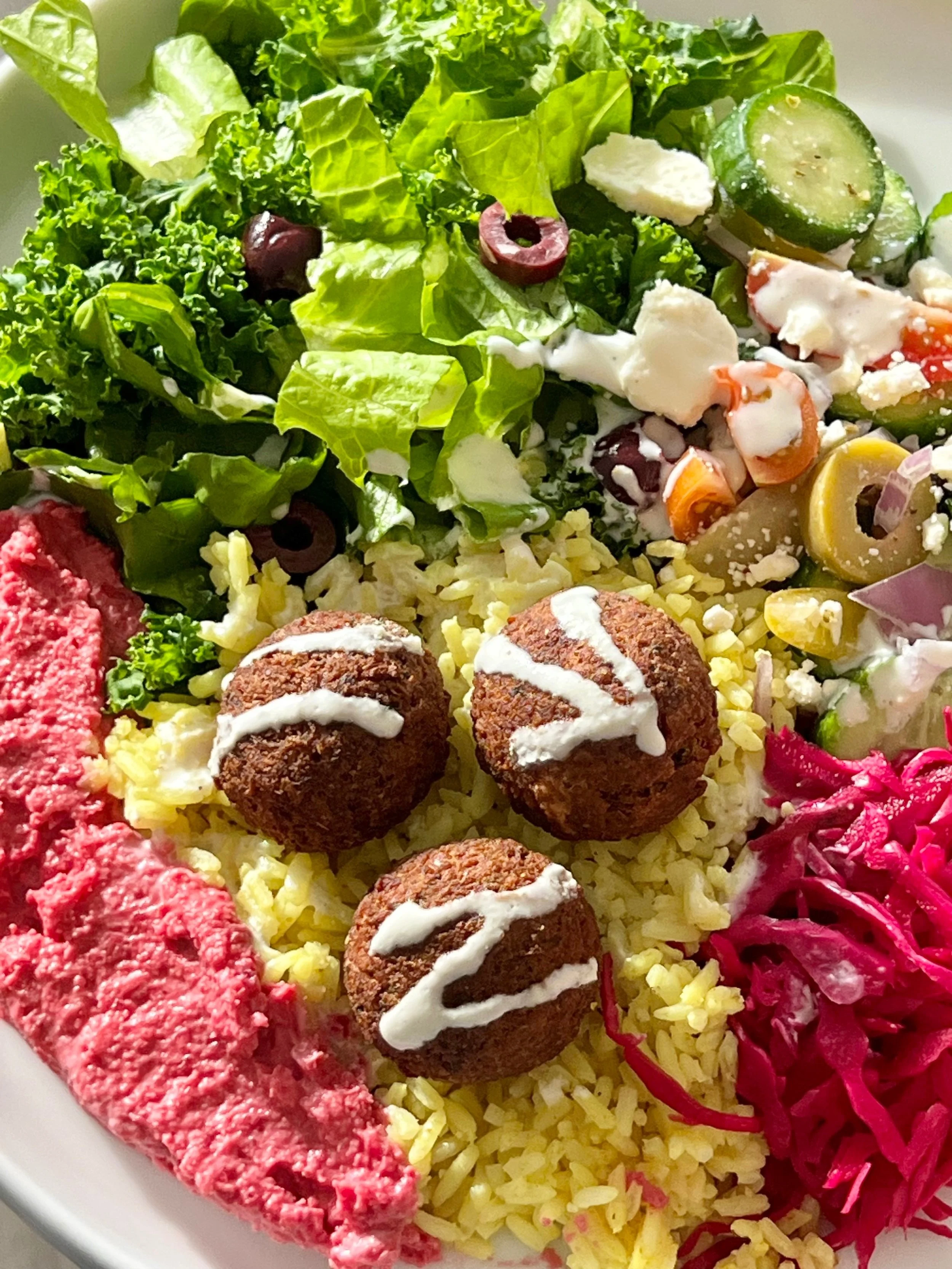 There are a few different elements to this dish, and I highly recommend making extra so you can have it for lunch a few days in a row. Our version includes falafels but you could easily add or sub in grilled chicken.