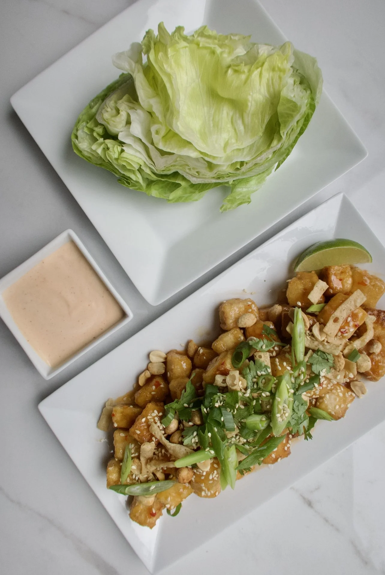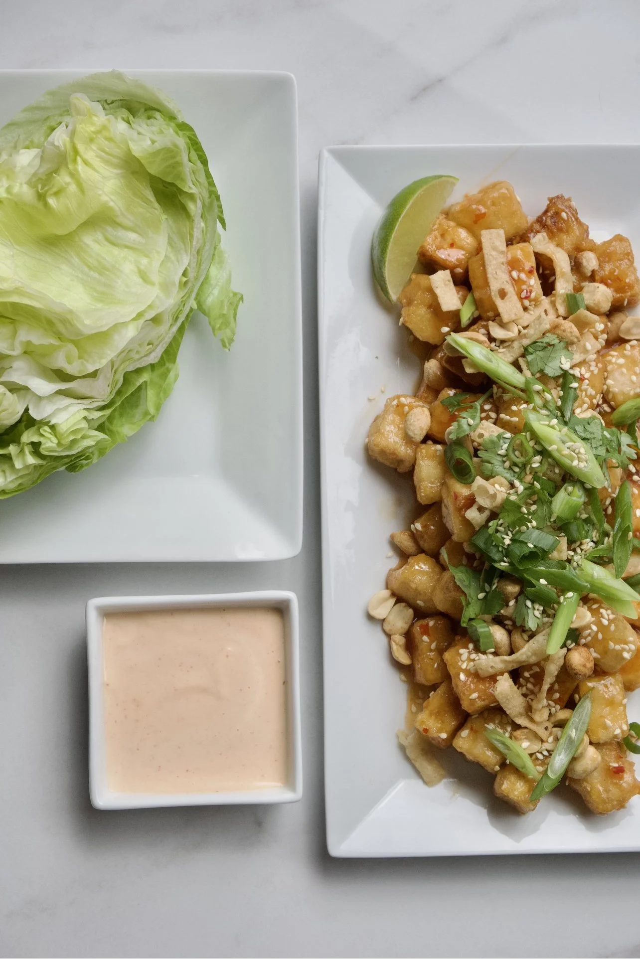 ASSEMBLY Plate the tofu on the long skinny plate and top with wontons, scallions, sesame seeds and cilantro. Serve with ice burg lettuce and the spicy mayo with an optional lime wedge. Make a wrap! Grab some lettuce and drizzle with the spicy yogurt sauce.
