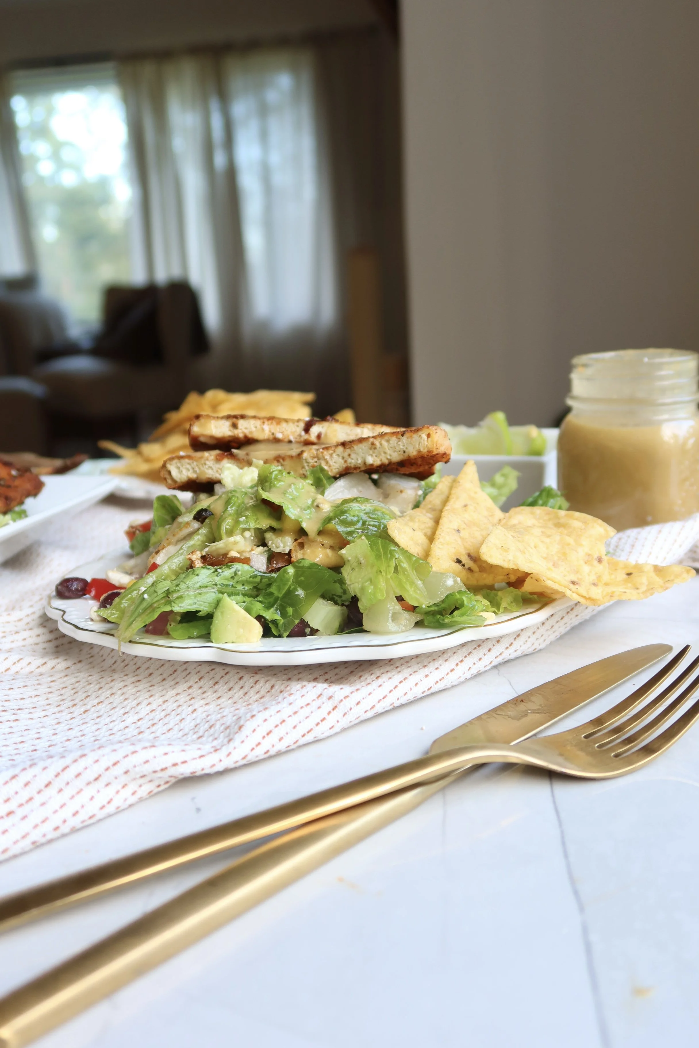 SALAD Wash, dry and chop the lettuce and add to a large bowl. Add the corn, beans, red pepper, onion and dates along with 5-6 tablespoons of the dressing and toss to coast. Taste to see if you want more dressing, then add to a serving plate and top with feta, tofu and avocado. Serve with tortilla chips.